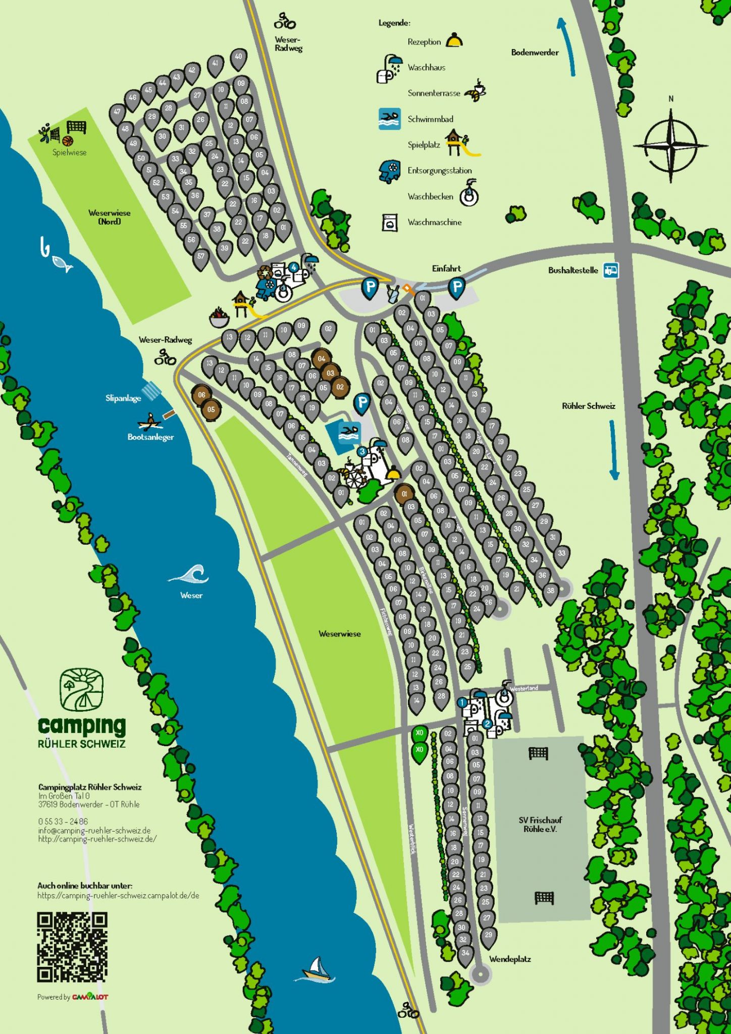 Take the B83 from Hameln-Höxter to Bodenwerder and continue over the Weser bridge. Turn right at the next set of traffic lights and continue straight on along the banks of the Weser for another 3 km towards Rühle. The campsite is well signposted.